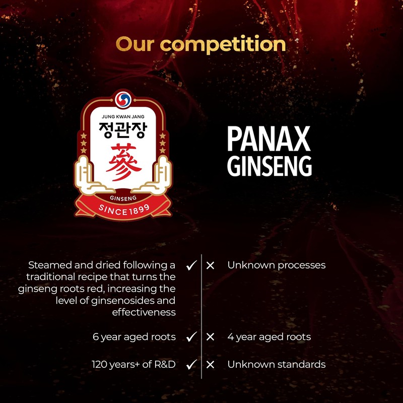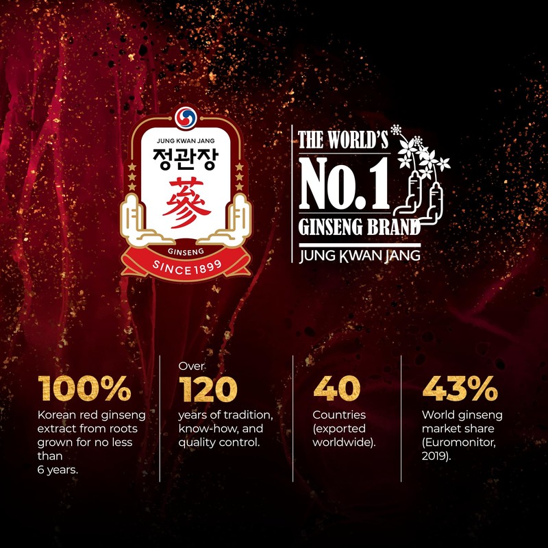- The No. 1 Korean Ginseng Brand Worldwide - For 120+ years, JUNG KWAN JANG has perfected Korean Red Ginseng from soil to extraction. We use only Panax Ginseng, aged 6 years for maximum potency and effectiveness.
