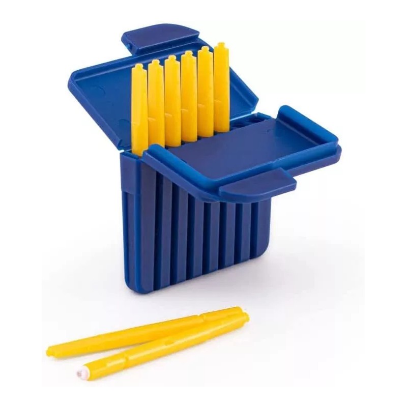 1. Inserta el extremo vacío de la barra de aplicación amarilla en el protector de cera utilizado en el dispositivo auditivo. NOTA: empuja el palo amarillo directamente en el oído transparente usado. No hay necesidad de girar el palo amarillo.