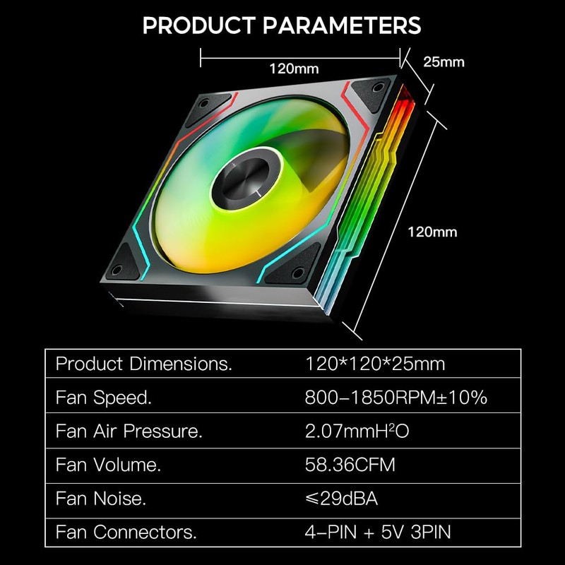 • Jungle Leopard Star Trail size 120 (L) x 120 (W) x 25 (H) mm, intelligent temperature control 4PIN PWM, full load speed 800-1850RPM ± 10%, 58.36CFM high air volume, 2.07mmH2O high wind pressure, noise ≤ 29dBA, input voltage 12V, input current 0.19A, HDB bearing life. cool and quiet computing environment for the system