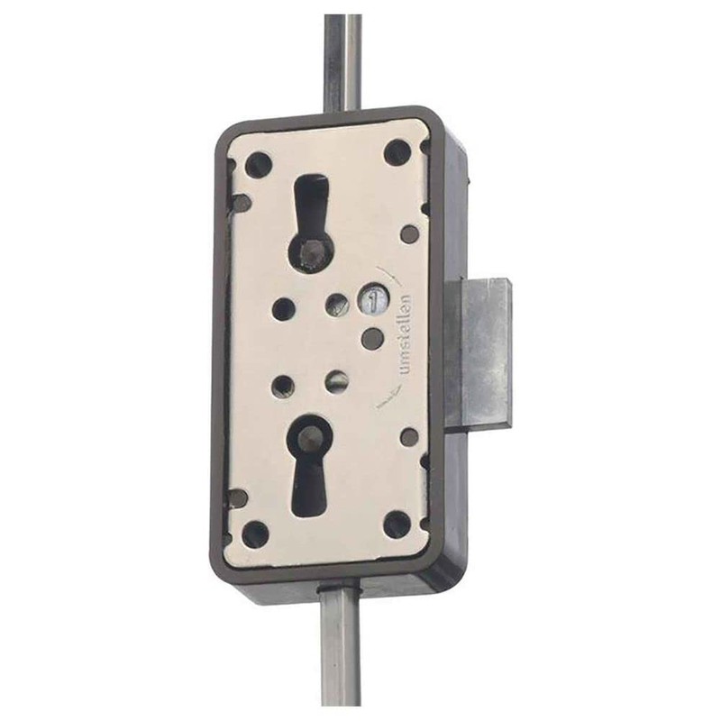 - Three-locking lock 1-6, box made of plastic, can be used right and left. 1 nickel-plated key, beard 8 x 6 mm, profile rod diameter 6 mm, 1 angle plate, 2 locking hooks nickel-plated metal, 2 nickel-plated clamps, 2 locking bolts on plate nickel-plated, 15 and 20 mm mandrel combined in one lock.