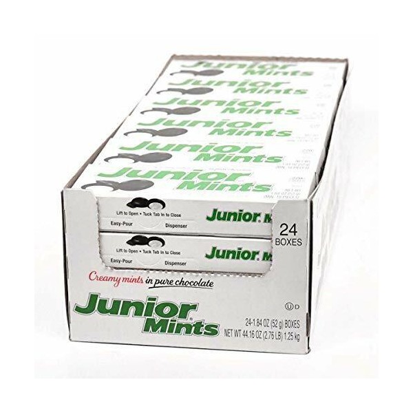 - Junior Mints, America's favorite chocolate covered creamy mint. | 24-count of 1.84 oz. boxes of creamy, chocolate-covered Junior Mints | Junior Mints are a great pass-around treat, or quick way to keep a delicious snack on hand | Junior Mints come in the regular button size you know, and also in a Junior Mint Mini size | Junior Mints are Kosher, Peanut Free and Gluten Free.