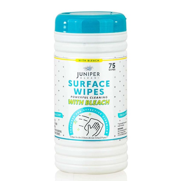 Juniper CLEAN 1 Pack Surface Cleaning Wipes with Bleach, All-Purpose Cleaner for Bathroom, Kitchen, Office, 75 Count Canister, 7.5" x 7" Sheet, Fresh Scent, Lint Free & Durable