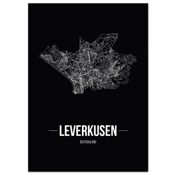 - JUNIWORDS Stadtplan Leverkusen (Schrift B) in der Größe 21 x 30 cm auf schwarzem Hintergrund.