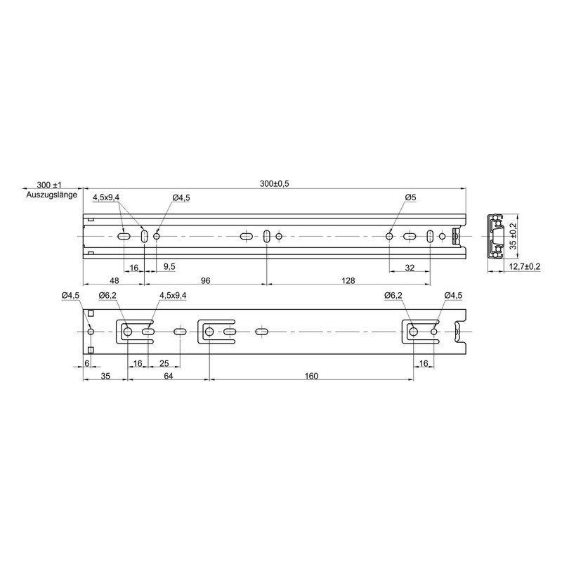 - Length: 300 mm, height: 35 mm, width: 12.7 mm
