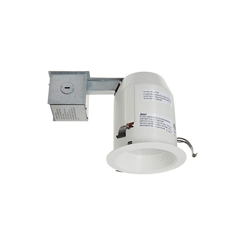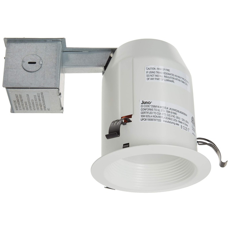 - The JUNO 4-in white recessed baffle kit includes a remodel housing, decorative trim with integrated LEDs, wire nuts and a cutting stencil all in one box