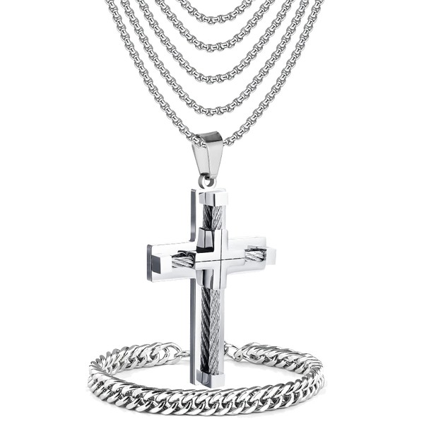 JUNOVUROS Large and Small Men's Cross Necklace Set with 5 Rolo Chains and 1 Cuban Bracelet, Jesus Christ Cross Religious Jewelry Gift, Silver/Gold/Black