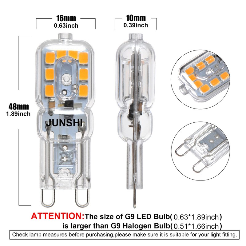 - ★ATTENTION:Please don't use them with dimmer switch, or there might be flicker and noise;Check lamp measures before purchasing,our products size:0.63*1.89inch(G9 Halogen 0.51*1.65inch).please make sure it is suitable for your light fitting.