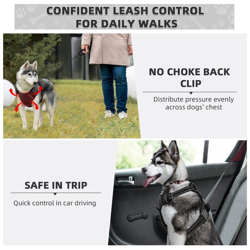 - 【No Pull, No Choke】 - Our non-pulling dog harness is specially designed with 2 metal leash rings for safer dog walks. Use the chest attachment clip to stop your dog from pulling on walks, perfect for dog training or dogs who tend to pull. The back one is great for casual walks, jogging, hiking, etc
