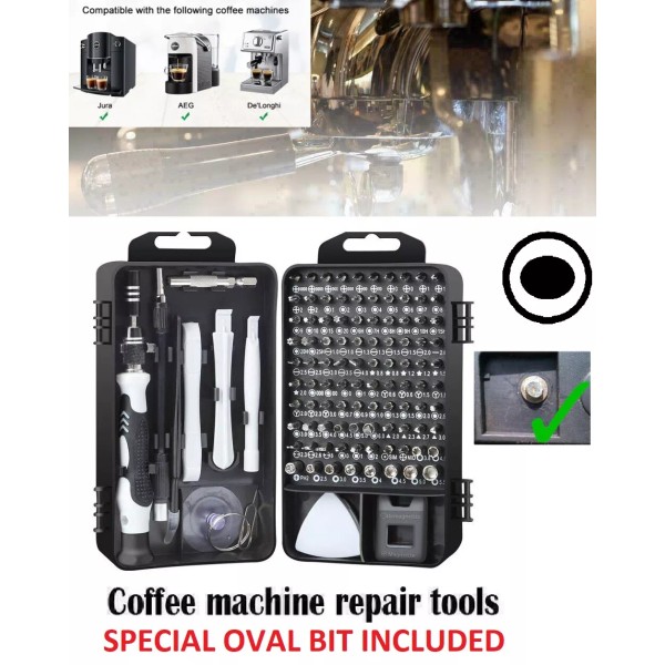 This listing is for a driver and shop quality bits that will open all the special screws used in most Jura, Jura Capresso, Delonghi, Nespresso, Starbucks Verismo, Magimix, Franke, Siemens, Krups and AEG machines. The set consists of: