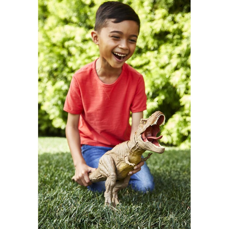 Jurassic World animated series, Camp Cretaceous! This larger-scale dinosaur action figure features "Primal Attack" which enables kids to control the battle play with awesome battle moves. Move the tail up and down, side to side and around for head movements, body twists and an awesome chomping action (activate all moves at once for total animated control of the figure). Push and hold the button on the tail for the ultimate epic ROAR and realistic shaking! The dinosaur action figure also features authentic sculpting, movable joints, authentic color and realistic texture. Recreate all the epic battle- action scenes with this Epic Roarin' Tyrannosaurus Rex—but watch out—this Tyrannosaurus Rex has a huge ROAR and even bigger BITE! Makes a great gift for ages 4 years old and up especially fans of Jurassic World, dinosaurs and action play! Colors and decorations may vary. For more dinosaur fun, download the Jurassic World Facts app (Android and iOS) to scan and watch your dinosaur come to life, zoom in on dinosaurs up close, hear dinosaur roars, learn fun dinosaur facts and more!