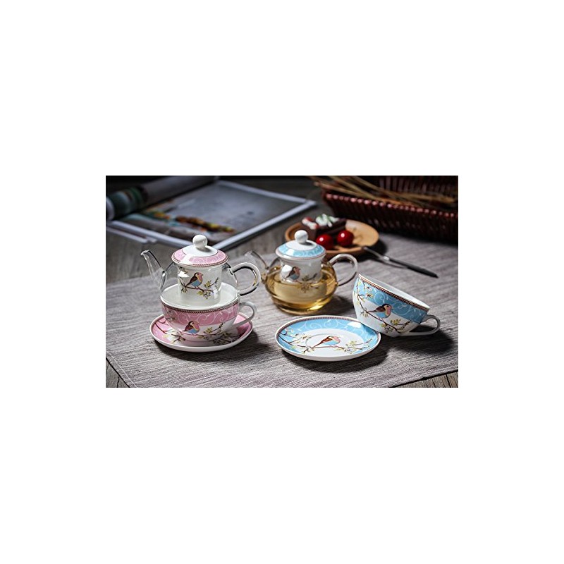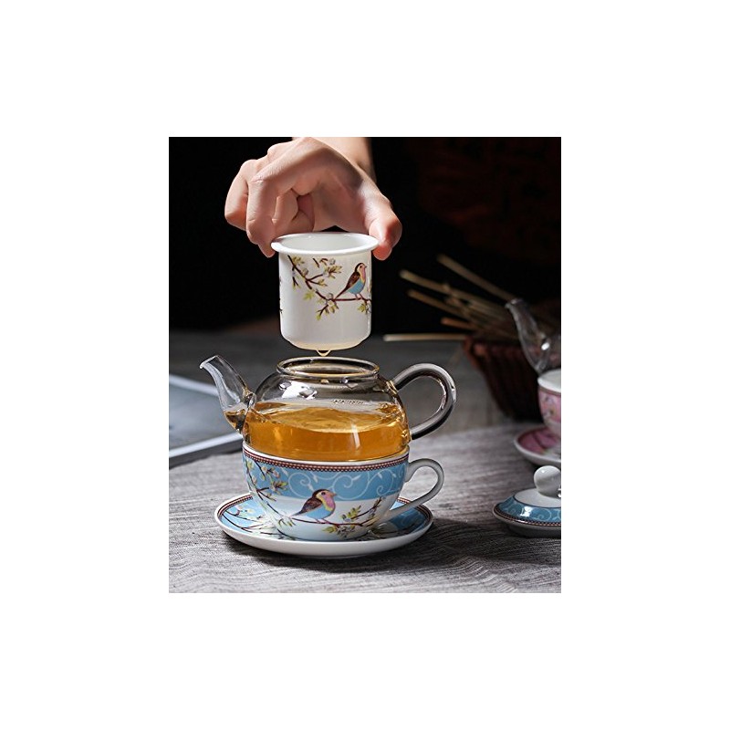 Jusalpha Glass Teapot with a Fine China Infuser Strainer, Cup and Saucer Set,Teapot and Teacup for One, Tea for one #05 (Blue)