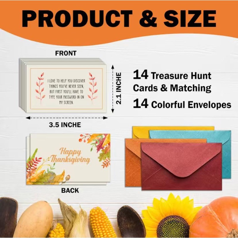 - What you get: 14 exquisite and small Thanksgiving treasure hunt cards and 14 colorful envelopes, each card measures 2.1×3.5 inches.