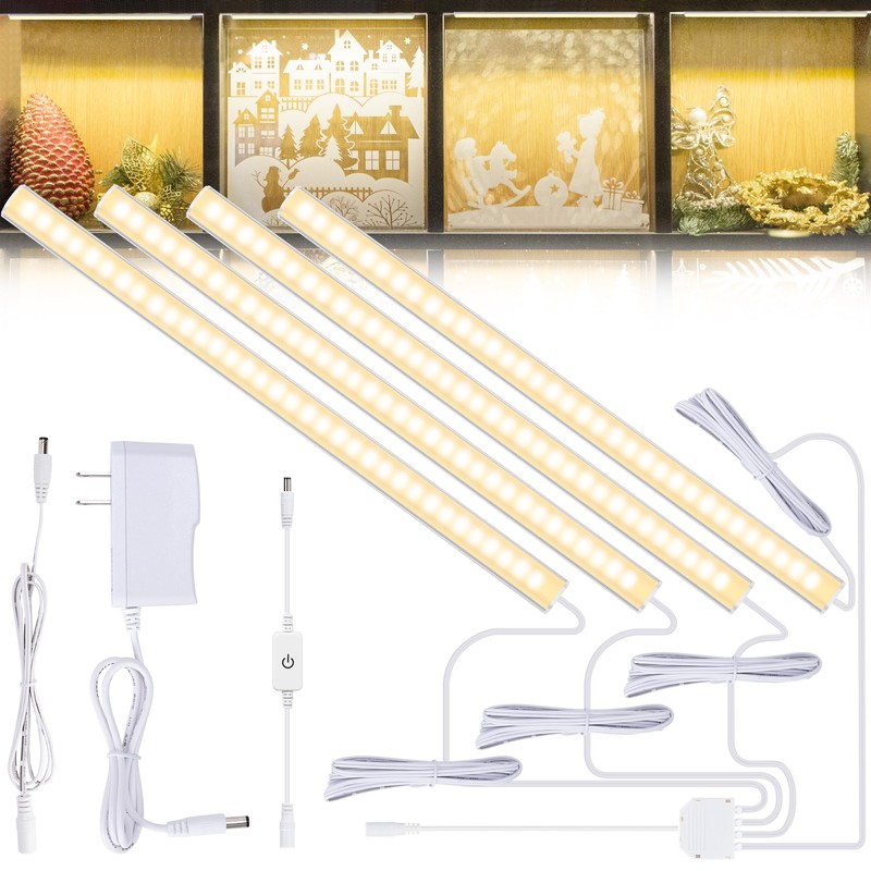 JUSJUBR 4PCS x 12inch Display Cabinet Lights Warm White, Dimmable LED Shelf Lighting with Memory Function, Bookshelf Lighting, LED Lights for Display Case/Pantry/Closet/Safe, 3000K