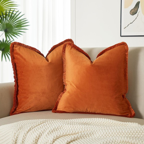 JUSPURBET Rust Velvet Throw Pillow Covers 24x24 Inch Set of 2 with Soft Tassel Fringe Luxury Boho Pillowcase for Sofa Couch Bed Home Decor Machine Washable