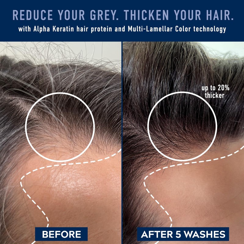 - CGX + THK innovative hair dye shampoo gradually reduces grey with every wash while also thickening hair up to 20%*. Gently and thoroughly cleans and revitalizes your hair, increasing volume for a thicker, fuller look.