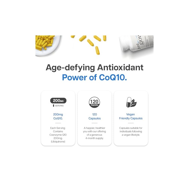 - Powerful Antioxidant: Each capsule of Just Glow Coenzyme Q10 contains 200mg of CoQ10 (Ubiquinone).