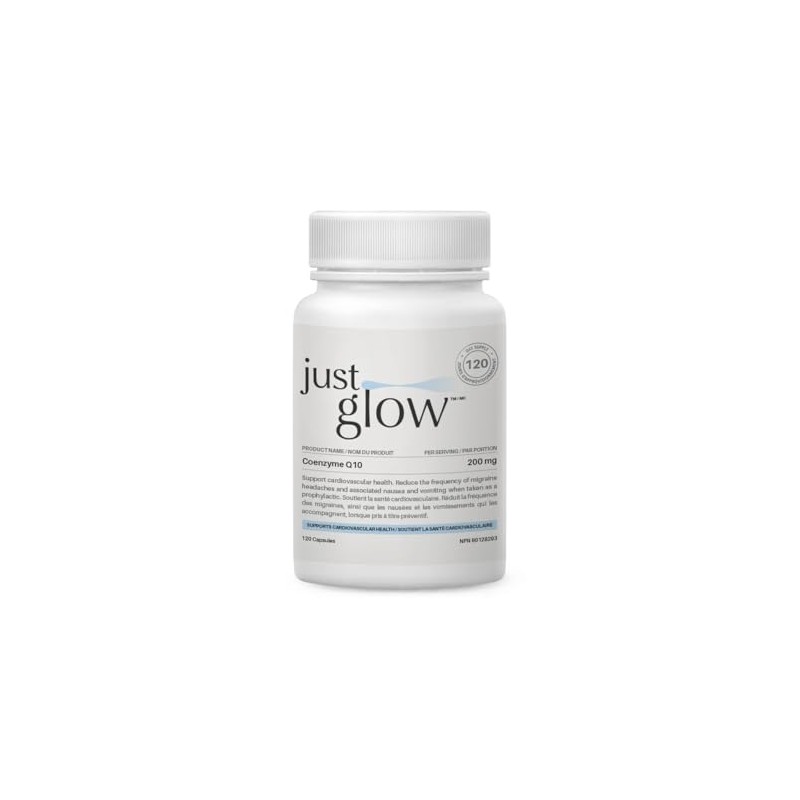 Just Glow Naturally: Coenzyme Q10 200mg - 120 Capsules - CoQ10 Ubiquinone Supplement - Experience the Power of a Natural Antioxidant for Supporting Cardiovascular Health and Alleviating Migraines & Headaches - Made in Canada - 120 Days Supply