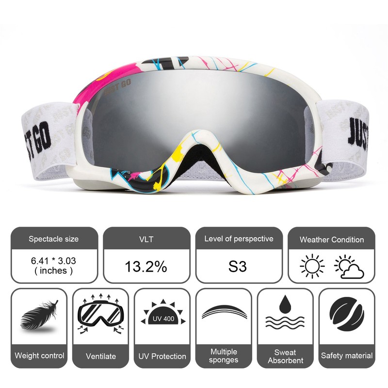 - JUST GO kids ski goggles with perfect design, Make 4 – 15 years kids more comfortable. Reliable TPU frame never breaks and extreme safe for you enjoy the snow sport.