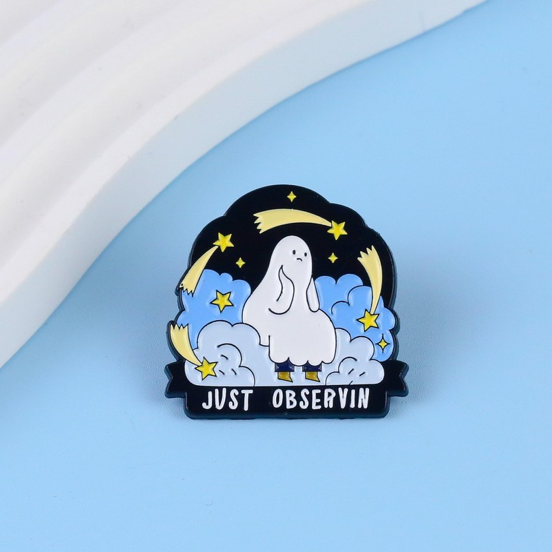 - WHIMSICAL DESIGN: Cute ghost enamel pin featuring a starry night scene with blue clouds and yellow stars, complete with 'JUST OBSERVIN' text for a playful touch