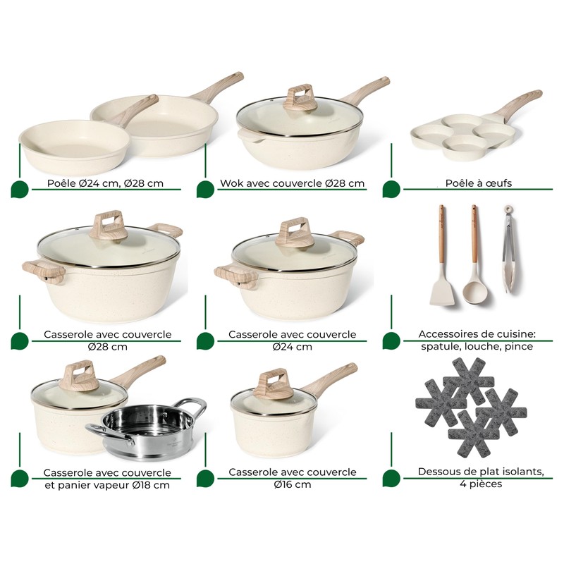 - Complete cookware set: incl-s 9.45 & 11 inch Non stick pots and pans set of 2*2 frying pans nonstick with lid, wokpan with lid 11 inch, egg pan, saucepan with lid and steamer 7 inch, saucepan with lid 6.3 inch, spatula, ladle, tongs, 4*pan protectors for all your cooking needs