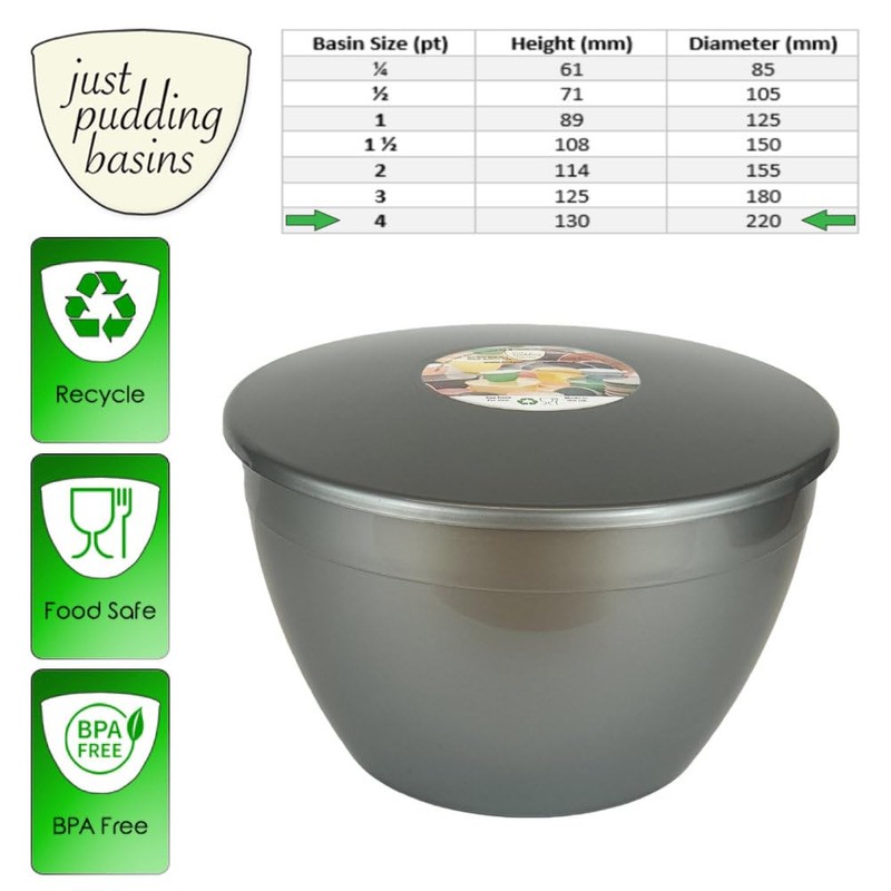 Just Pudding Basins 4 Pint Large Bowl with Lid for Steaming and Mixing Durable Plastic Dishwasher Safe Colour Silver