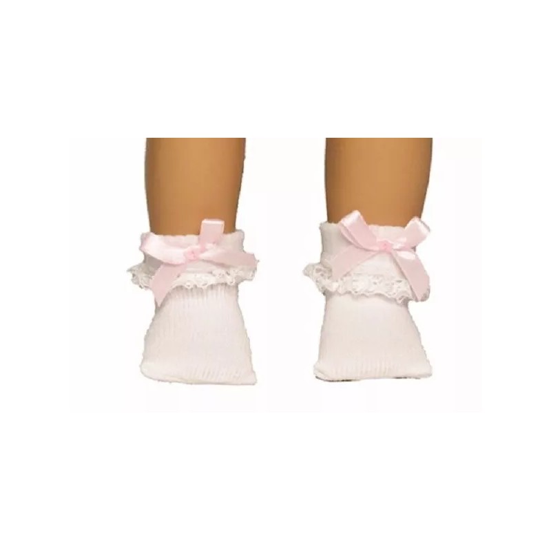 Add a touch of sweetness to your doll's wardrobe with these beautiful White Lace Socks with Satin Pink Bow! Designed to fit 18-Inch dolls, these socks feature delicate lace detailing that adds a special touch to any outfit. Made from soft and comfortable materials, your doll's feet will stay cozy and comfortable all day long. Whether she's dressing up for a special occasion or just lounging around the house, these White Lace Socks are the perfect finishing touch. With a snug fit that stays in place, you can be sure that your doll's feet will look great no matter what. Don't wait, complete your doll's wardrobe today!