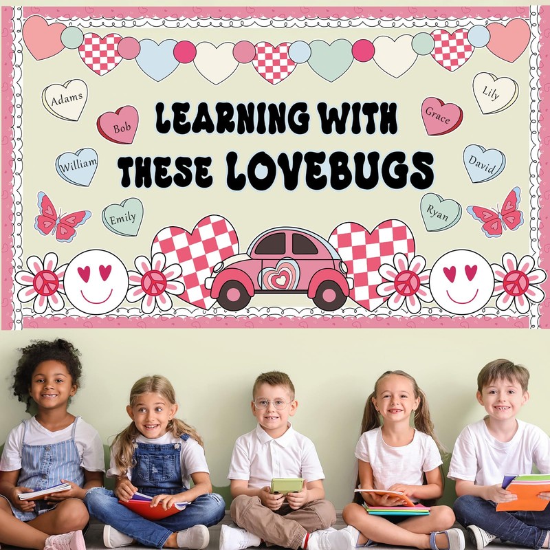 - DIY fun: Making you valentine's day party decorations a breeze with this groovy valentine bulletin board set. Student’s can write down their names on the paper heart cutouts or attach their photos to it, the learning with these lovebugs bulletin board decors can be stick anywhere with adhesive dots included. It is quick and simple for you to make a valentine's day decoration for classroom.