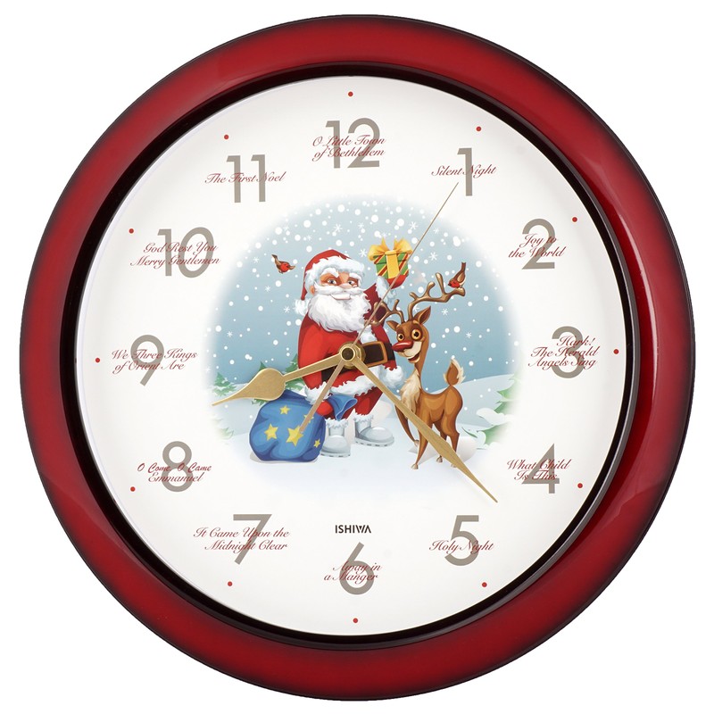 - A Christmas carol wall clock features unique illustrated Santa Claus & Reindeer dial with Christmas tone casing.