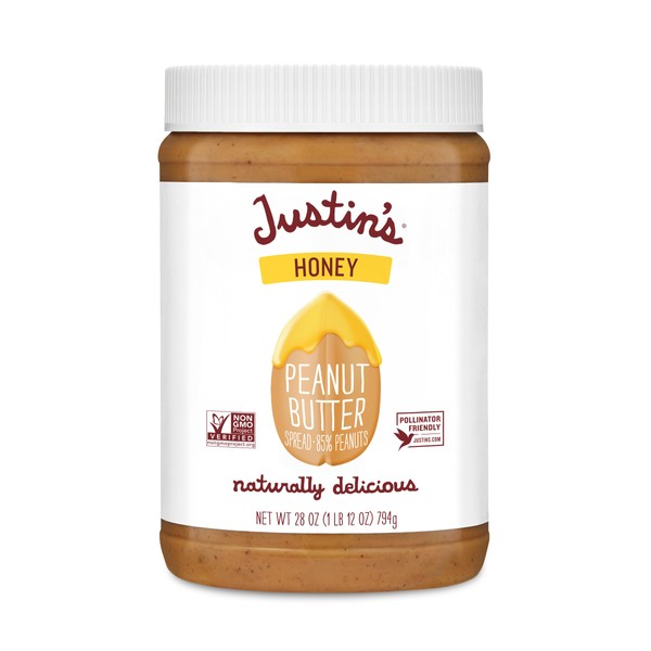 - 28oz Jar of Justin's naturally delicious Honey Peanut Butter, perfect for tasty sandwiches and toast, or for healthy snacking