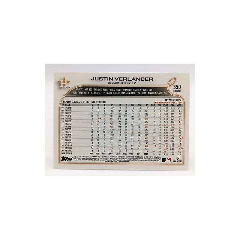 Justin Verlander Baseball Card 2022 Topps Series Two #350