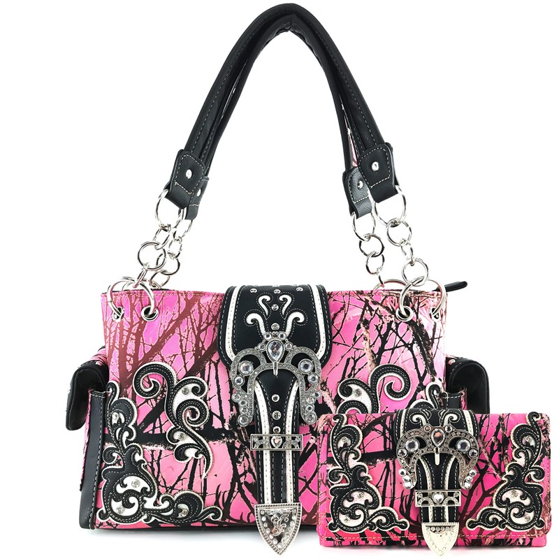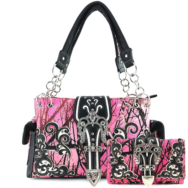 Justin West Camouflage Tree Branches Bling Rhinestone Cross Wings Buckle Crossbody Chain Messenger and Purse (Buckle Pink Handbag Wallet Set)