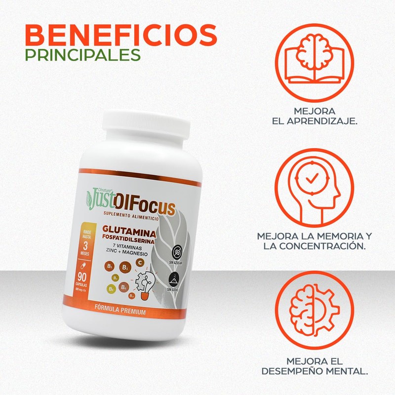 - JustOlfocus proporciona los nutrientes necesarios para ayudar a mejorar la neurotrasminisión y el funcionamiento del cerebro como la memoria, el aprendizaje y más.