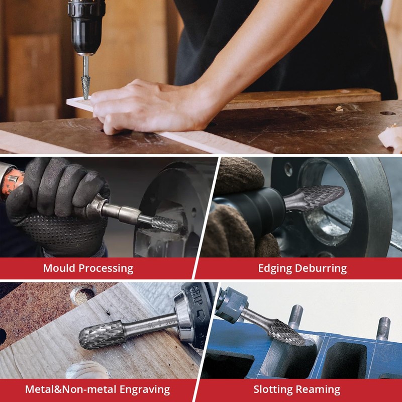 - 【SUITABLE FOR MULTIPLE MATERIALS & TASKS】Packed with the most commonly used shapes, this 10PC carbide burr set is compatible with most rotary tools and die grinders, serving as a go-to solution for any garage, workshop, or home project. From wood carving to metal grinding, this rotary wood carving bits kit handles it all. Ideal for DIYers and pros working on iron, steel, wood, plastic, or even stone – a truly versatile set of cutting burrs and die grinder bits