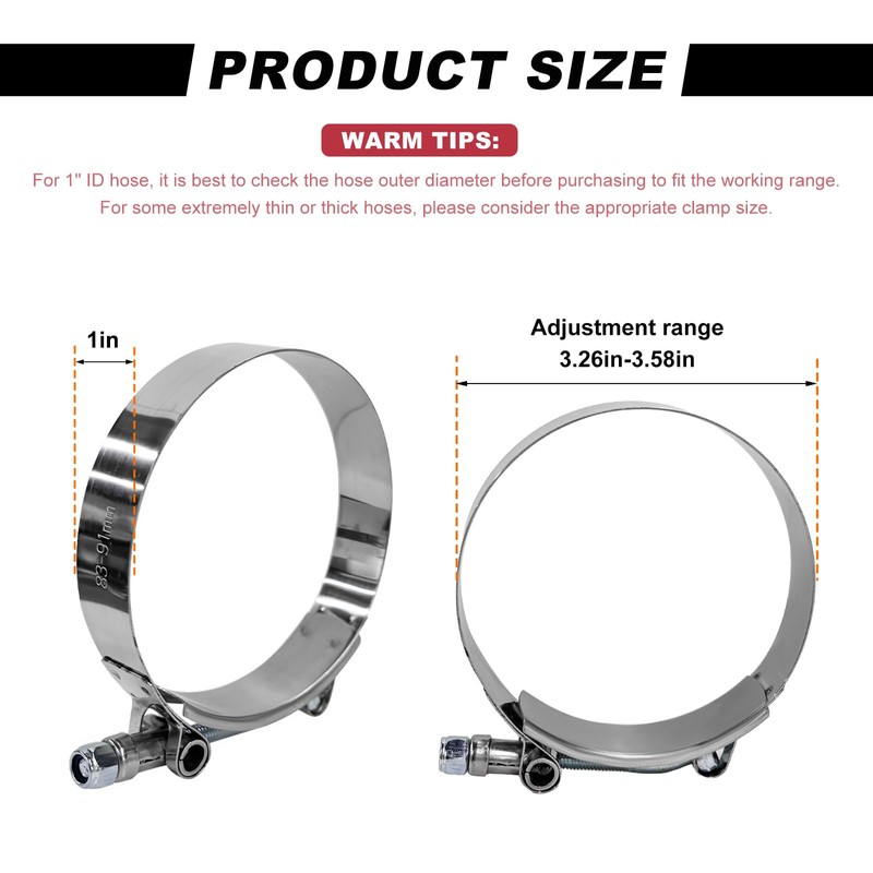 JUSTTOP 2PCS 3 Inch T-Bolt Hose Clamp, Adjustable 83-91mm Clamp Range for 3" Hose ID, Stainless Steel Heavy Duty Pipe Clamps for Turbo Intake Intercooler, Car Accessories