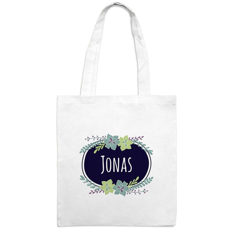 Jute Bag with Name Jonas – Flowers Motif – White – Fabric Bag, Jute Bag, Hipster Bag, White