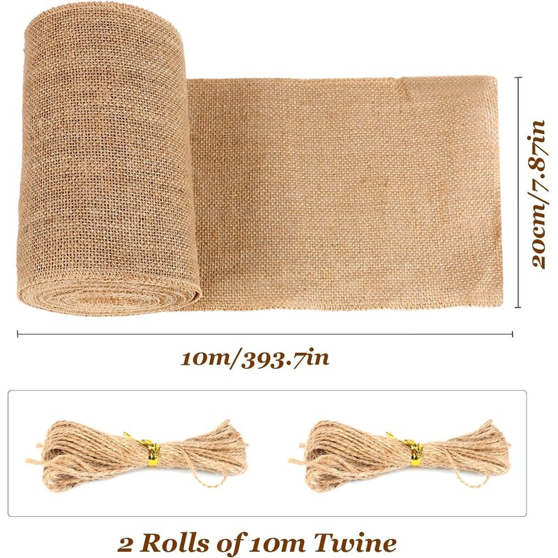 - Flexible & Easy to Use Our burlap tablecloths are 30 cm wide and 10 m long and are suitable for most long wedding tables placed in the middle of the table. The box contents include 2 rolls of 10 m cord, so you can design and decorate our tables as desired. Let your creativity run wild and create jute decorations for weddings, christenings or other outdoor events.