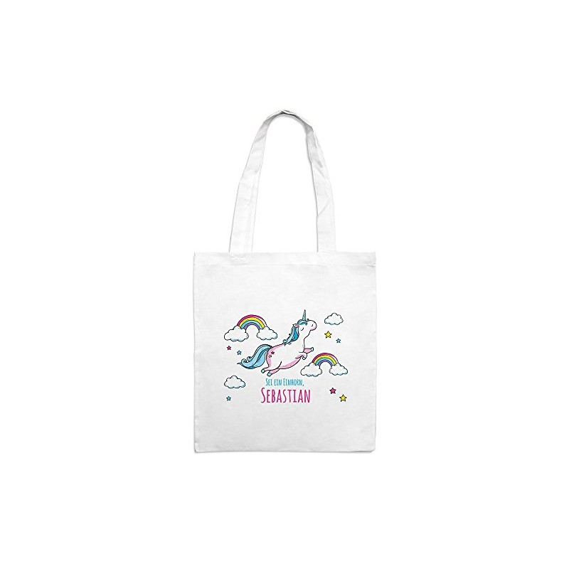 Jutebeutel mit Namen Sebastian - Motiv Dickes Einhorn - Farbe weiß - Stoffbeutel, Jutesack, Hipster, Beutel