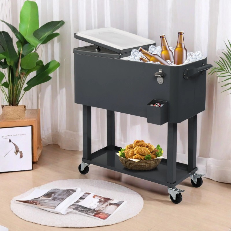 Elevate your outdoor gatherings with an all-in-one cooler cart! This cart features an ample 80-quart capacity to accommodate all your favorite beverages, while the lower shelf offers additional space for extra drinks or items you want to keep handy. Utilizing advanced injected molded insulation technology, the insulated basin ensures your drinks stay chilled for hours on end. Equipped with a bottle opener and cap catcher for easy cap removal and collection, and sturdy wheels for smooth mobility, including locking casters for stability when the cart is fully loaded. A convenient drainage cap makes cleaning up a breeze. Impress and entertain your guests with this stylish and top-quality rolling cooler cart!