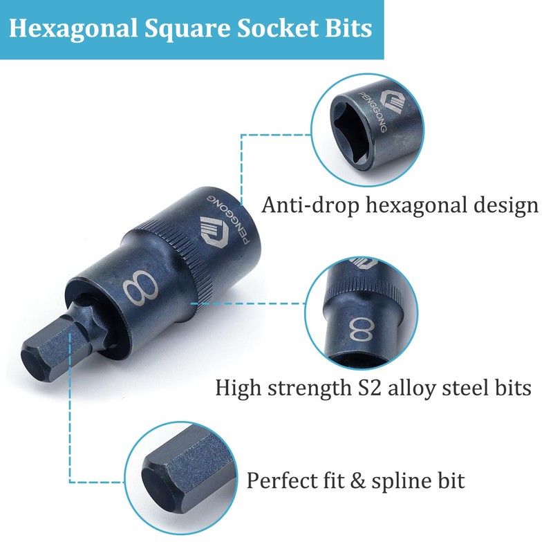 - Size - 1/2"square drive socket, H8 (8mm) hex bit, 2 inch (about 55mm) total length.