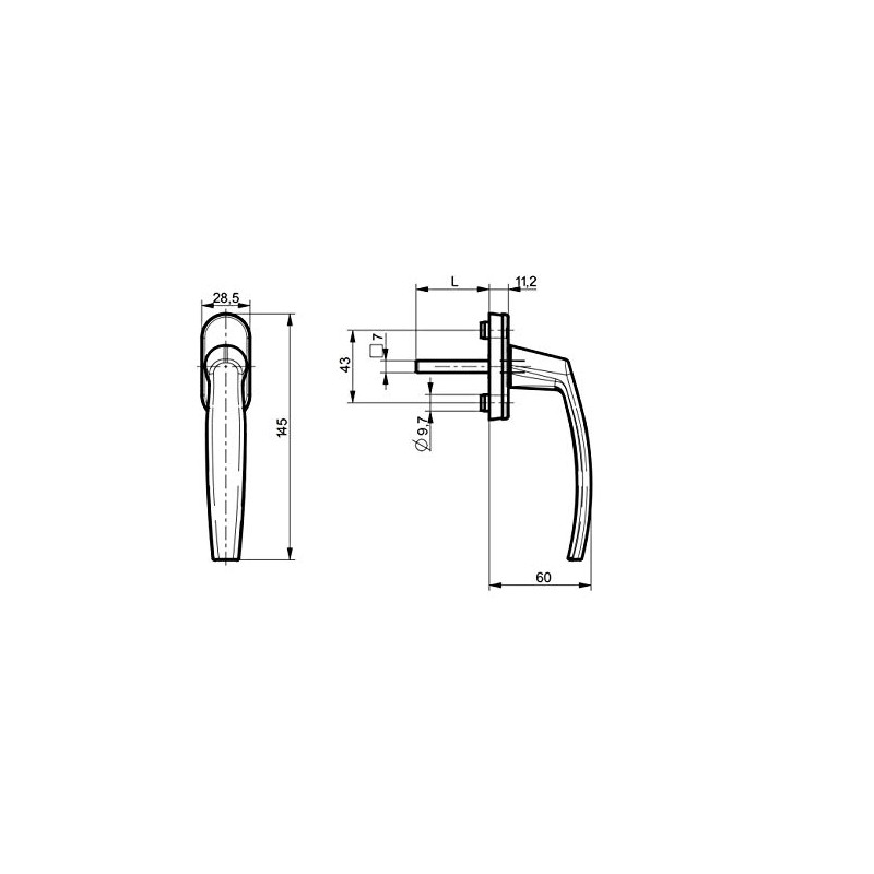 - Hole spacing: 43 mm - door handle length: 141 mm - window rosette: 28.5 mm - handle depth: 60 mm - pin length: 35 mm
