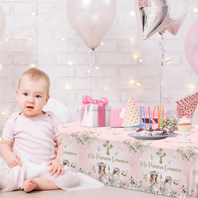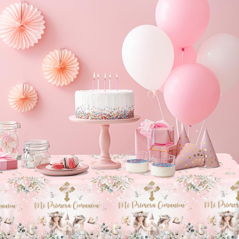 - 【First Communion Theme】Our first communion tablecloth featured with a girl is praying devoutly among church, golden cross and blooming flowers, that is embellished with gold letters “Mi Primera Comunion”. Fantastic design creates a cozy atmosphere for first communion party.
