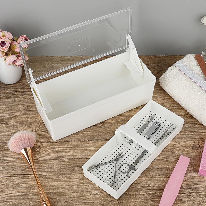 - This nail art tool sterilizer box is made of a sturdy yet lightweight plastic. It is easily cleaned and sanitized. Nail tools container features transparent lid design, we can see what is inside of it without opening it.