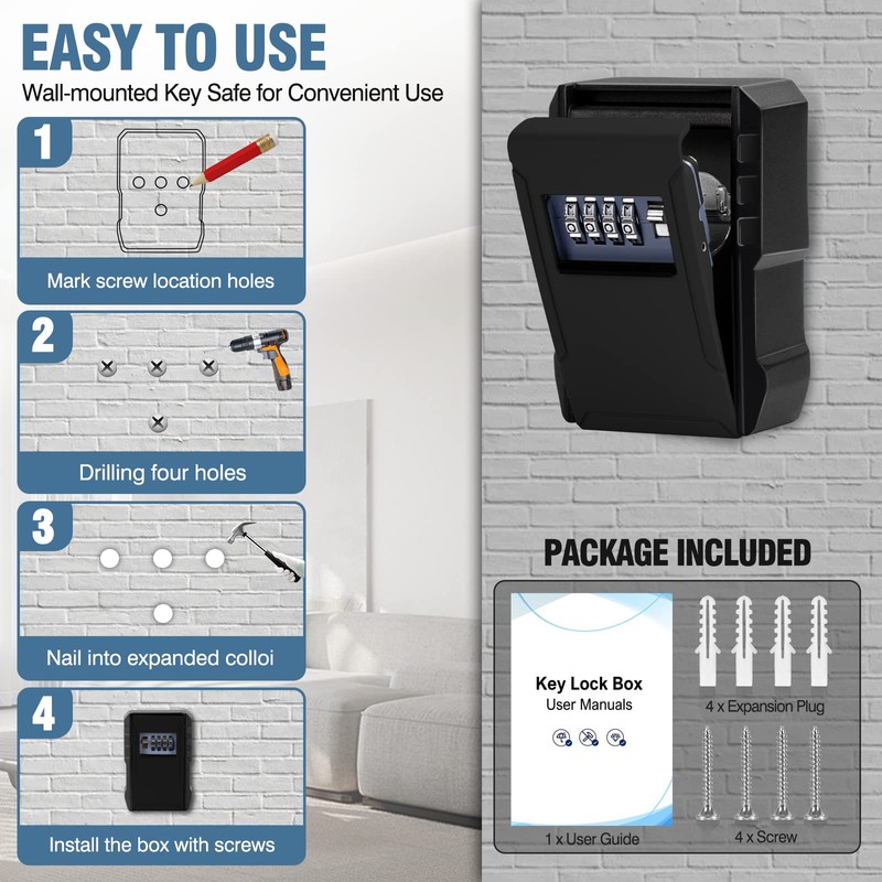 - Easy to install: the key safe outside comes with all necessary fasteners, including 4 screws and 4 nylon expansion dowels, as well as instructions (English language not guaranteed), simply insert the screws and plastic expansion dowels into the wall or other hard surface and drill them, making it easy to install on the wall without buying additional hardware.