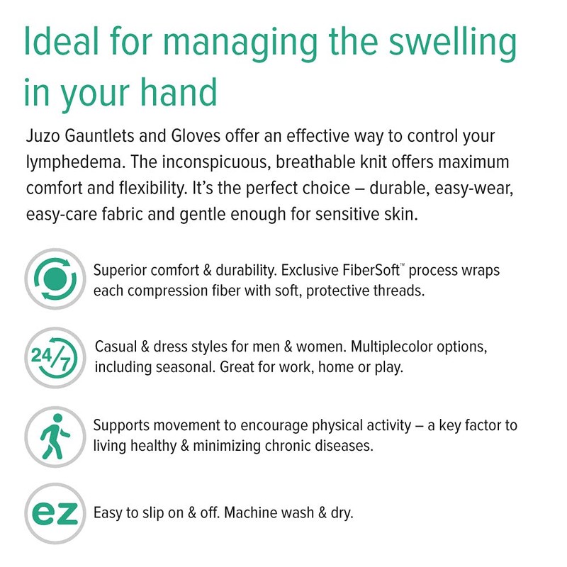 • No matter what your style, you’ll always look good – and feel good – in a Juzo 2000 Seamless Glove or Gauntlet. Made with our softest lightweight material, our Seamless Soft gauntlets are designed to maximize your comfort all day while managing mild to moderate upper extremity lymphedema.