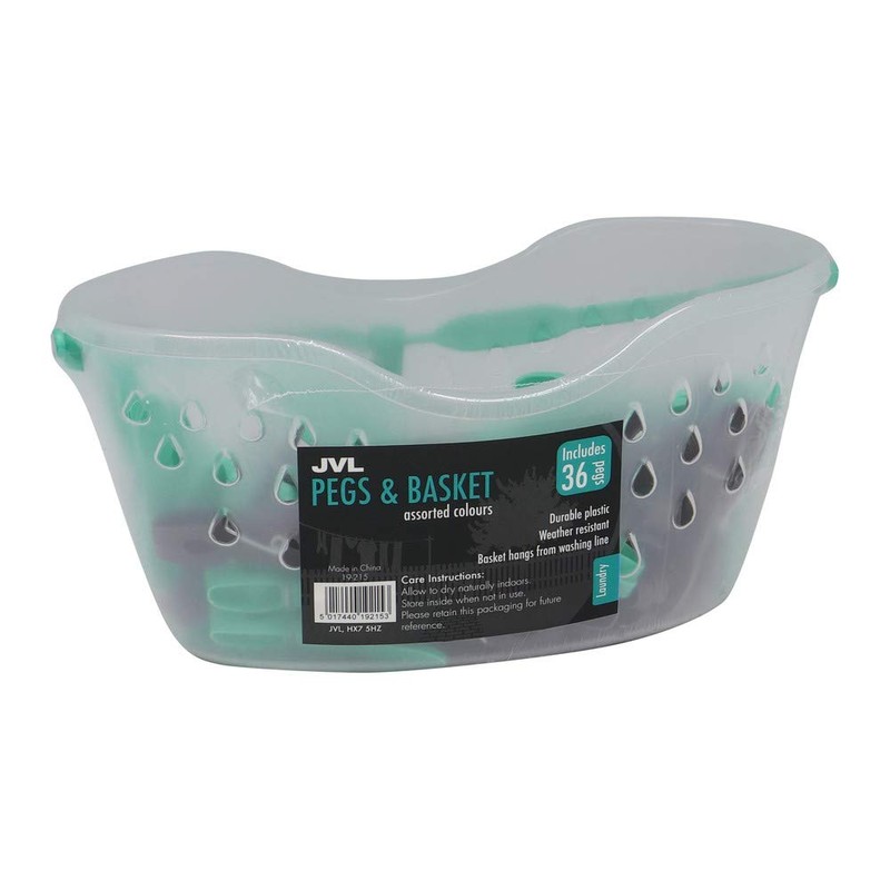 JVL Strong hanging 36 plastic clothes pegs with clear basket and hook