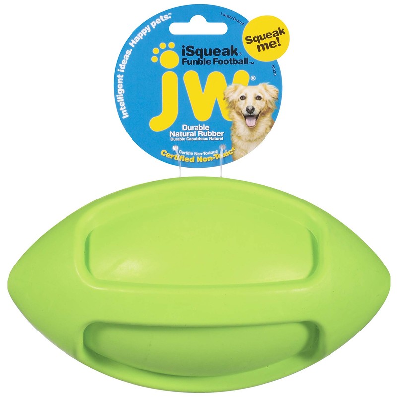 The new iSqueak Funble Football Large is a squeaky durable natural rubber ball. This sporty toy is meant to be tossed, passed, carried, and chewed. Available in fun bright colors, this size football is suitable for large and giant breed canine athletes.