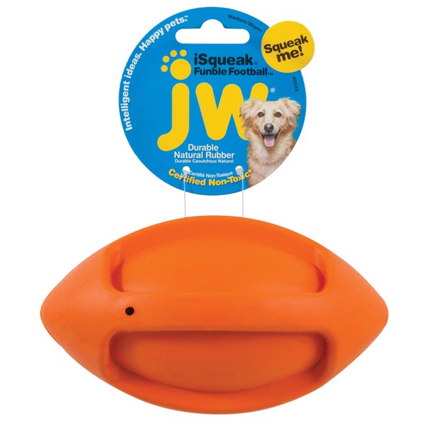 The new iSqueak Funble Football Medium is a squeaky durable natural rubber ball. This sporty toy is meant to be tossed, passed, carried, and chewed. Available in fun bright colors, this size football is suitable for medium breed canine athletes.