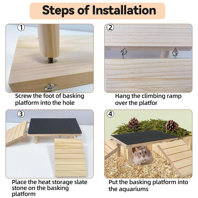 Designed for reptiles, the versatile hamster platform provides a safe and comfortable place for your hamsters, guinea pigs, gerbils, mice, chinchillas, etc. to climb, hide, rest, play and bask in the sun.