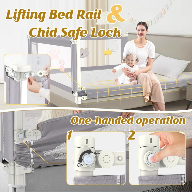 - Independent lifting: Our crib rails are designed with child locks, and both sides can be lifted and lowered independently, effectively preventing accidental handling, and making it easy for babies to get in and out of bed or for mothers to hold their babies; By pressing the gray buttons on both sides, the bed guardrail can be easily lowered, easy to use, and ensure the safety of your baby