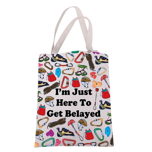 JXGZSO Bouldering Tote Bag Rock Climbing Lover Gift I'm Just Here To Get Belayed Tote Bag Boulderer Gift Sport Climber Gift, I'm Just Here to Get Belayed, Large